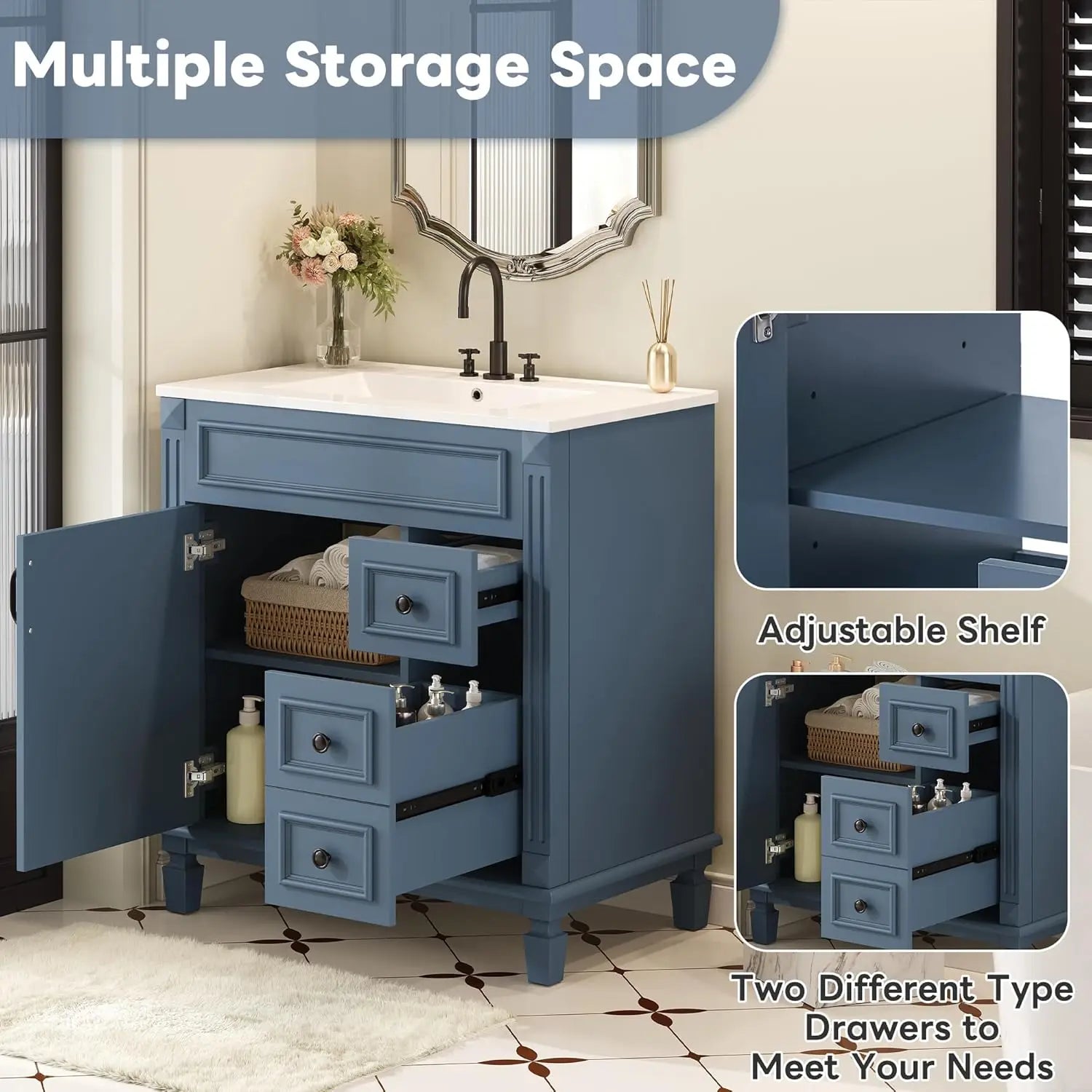 Maximized Storage Solutions - This 30" bathroom vanity maximizes every usable storage space with a top regular drawer for small items, like hair ties, lipstick or razor. One bottom deep drawer and a spacious cabinet with an adjustable shelf has ample space for storing towels or toiletry-filled baskets.