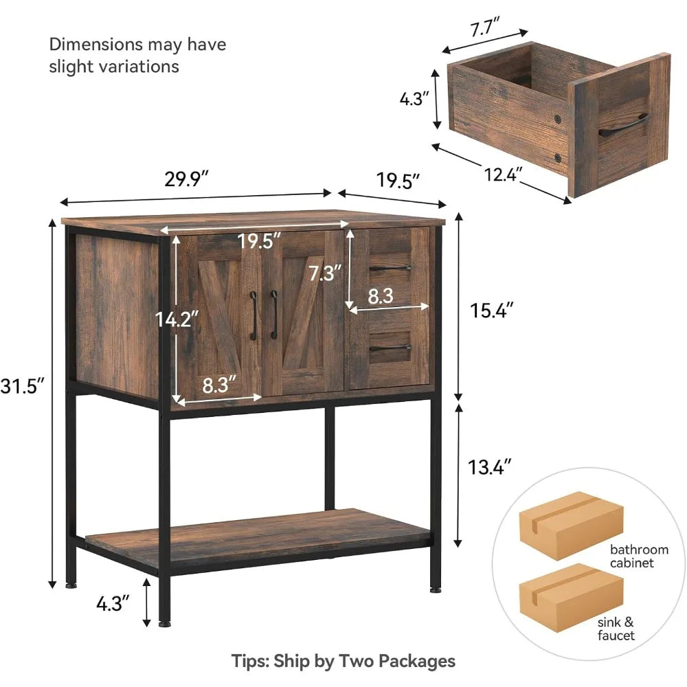 - Sturdy rustic farmhouse build uses a metal-reinforced MDF frame, a 29.9" L x 19.5" W x 31.5" H footprint, and adjustable anti-tip feet for stability on uneven floors.
