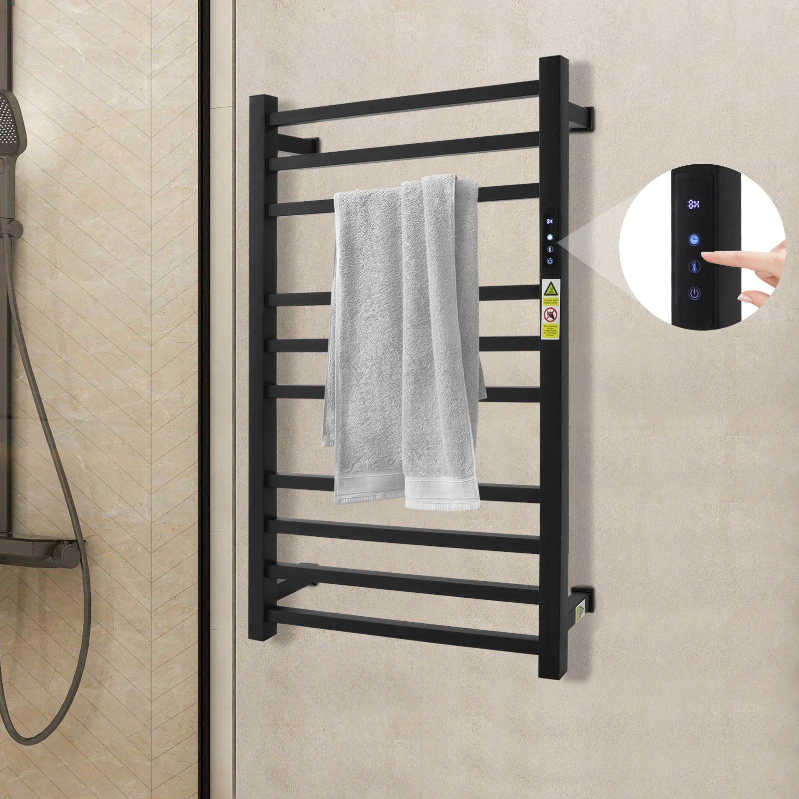 Transform your bathroom routine with this wall-mounted towel warmer rack designed for comfort and convenience. Featuring 10 heating rods with 120W power, it warms up to 44 pounds of towels to a luxurious 158°F in minutes, while eliminating moisture, mold, and odors. The programmable 0-24 hour timer lets you schedule heating automatically, so warm towels are ready when you need them. Built from corrosion-resistant stainless steel with a sleek black finish, it complements any décor and withstands humid bathroom environments. Safety features include an IP56 insulation rating and child-lock power button. Easy wall installation with included accessories makes setup effortless. Perfect for families seeking spa-like comfort at home or as a thoughtful housewarming gift.