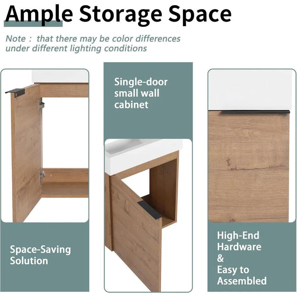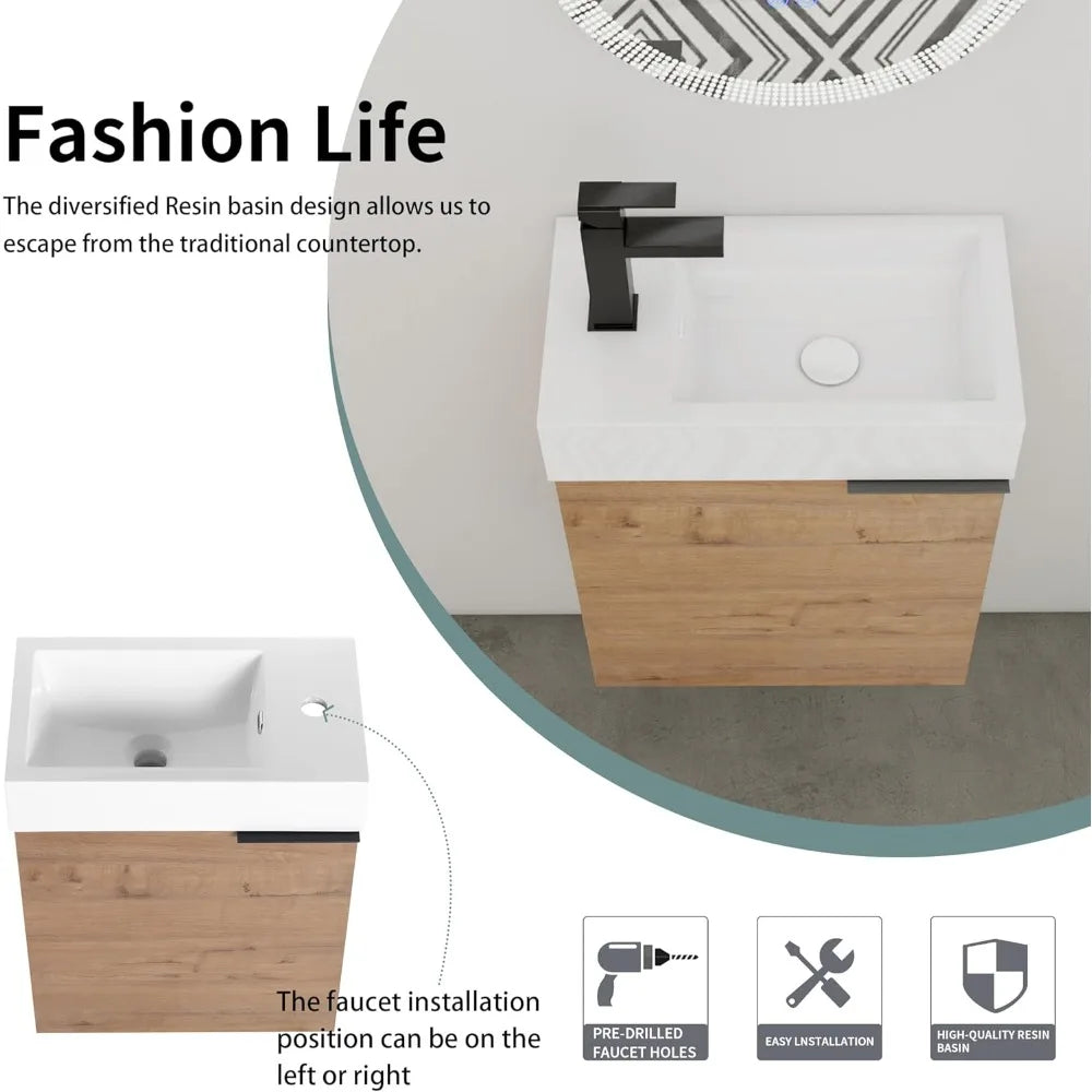 This product is an 18-inch small bathroom vanity designed to be wall-mounted, saving valuable floor space in your bathroom. It features a cabinet at the bottom that is perfect for storing dirty laundry baskets and cleaning supplies. Made from paint-free multi-plywood, this vanity is environmentally friendly and non-toxic, using high-quality, self-made eco-friendly glue that meets international standards. The vanity comes with a gel bathroom basin, which is more stable than ceramic or other types of sink basins and won't deform or damage over time. It also includes a soft-close system on the storage cabinet door to prevent vibrations from slamming doors, ensuring a quiet and peaceful bathroom environment. Assembly is hassle-free as the vanity base comes pre-assembled; you only need to attach the basin top to the cabinet. The package includes one vanity cabinet, one resin sink, and one metal handle, along with a parts package. Please note that the package does not include a faucet, pop-up drain, drain assembly, P-trap, back-splash, or mounting bracket.