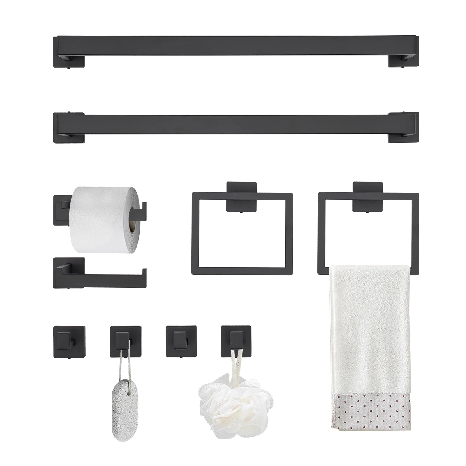 - Complete 10-piece set for comprehensive coverage: You receive 2 towel bars (15.75 in), 2 towel rings, 2 toilet paper holders, and 4 towel hooks—everything you need in one install.