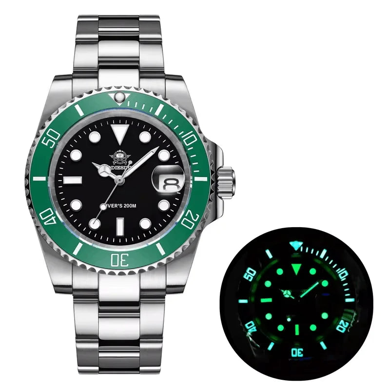 Designed for real life, not just on-screen allure. The classic case pairs with a durable stainless steel build, while a ceramic bezel enhances scratch resistance and longevity. The screw-in crown locks in water tightness, enabling a credible 200 meters of water resistance—so you can swim, snorkel, and wash with confidence without worrying about the dial or bezel.
